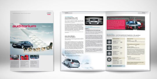 Extra-Steps für noch mehr Vorsprung BBM ergänzt das zentrale Marketing mit spezifischen Maßnahmen für die Niederlassung. Unter anderem wird uns die redaktionelle und grafische Mitentwicklung der ersten Kundenzeitung „Auditorium“ anvertraut. Als Akquise-Instrument für den B2B-Außendienst schaffen wir eine Großkunden-Broschüre und PPT-Präsentation. Audizentrum Stuttgart Imageaktionen Imageaktionen [...]